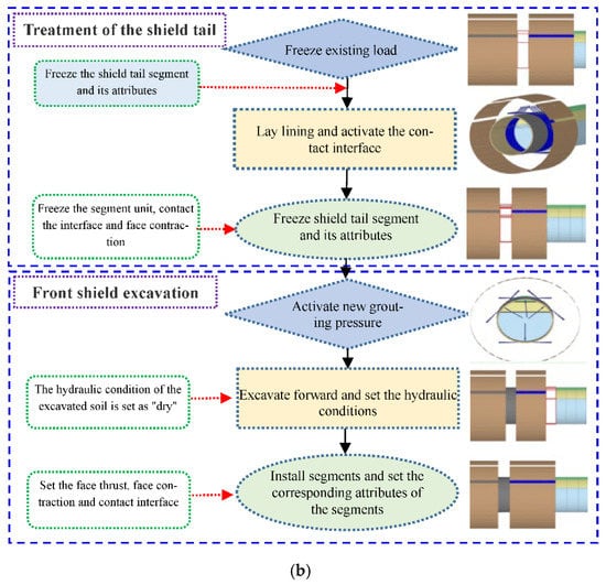 Construction of the numerical model and simulation of shield tunneling process. (a) The refined numerical model. (b) The simulation of shield tunneling process.