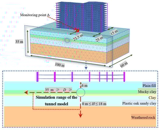 The geometric model of the tunnel is divided into several construction sections along the tunnel axis in order to reflect the construction process of the shield. The length of each section is 2 m and the shield machine drives from the front to the end of the layer model. The surface settlement monitoring point A is set at the horizontal distance of 23.5 m in front of the building model. The buried depths of the shield tunnel are 6, 9, 12, 15, and 18 m, respectively; the horizontal distance D between the center of the tunnel and the center of the building is 0, 5, 10, 15, 20, 25, 30, and 35 m, respectively. The numerical simulation scheme is shown in Figure 2.