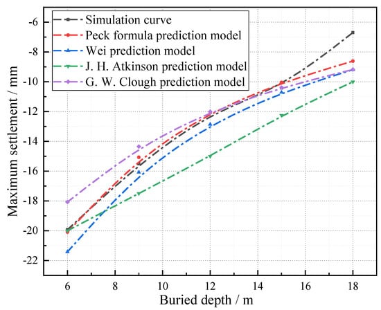 Using the above method, the values of the maximum settlement calculated by the numerical method, semi-empirical and semi-numerical method, or Peck formula at different H are obtained, and the results are shown in Figure 3. It can be seen from Figure 3 that the calculation results are in concurrence with the calculation results of the prediction model with the exception of the buried depth of the tunnel being H = 18 m. The main reason for H = 18 m being the exception is that in that case the stratum reaches the weathered rock layer, and the weathered rock in this model adopts the linear elastic constitutive model. Therefore, the values of the various coefficients in the theoretical calculation will be different from those of the soft soil.