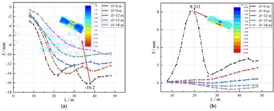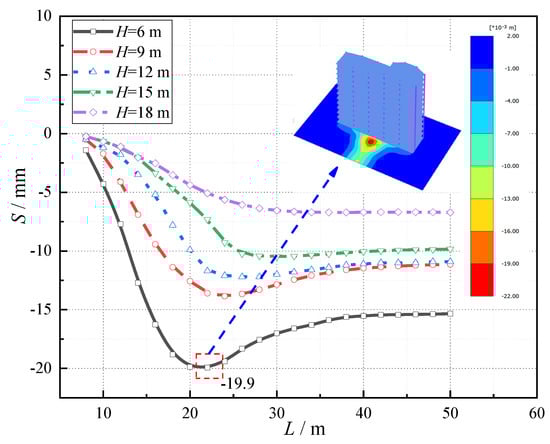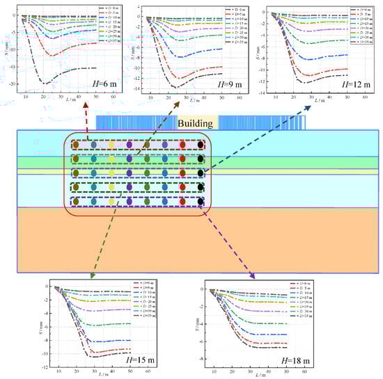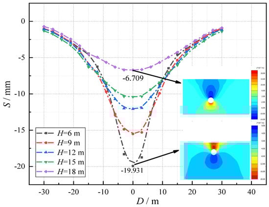 Figure 5 shows the horizontal section of the settlement at the monitoring point A. It can be seen from Figure 5 that S decreases with the increase in H. When H = 6 m, the settlement which is directly below monitoring point A equals S = 19.931 mm, and when H = 18 m, the settlement equals S = 6.709 mm. In addition, when the material and the size structure of the tunnel are consistent, the larger H is, the greater the width of the settlement is.