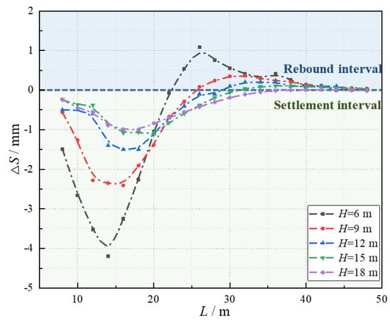 In order to reflect the variation law of the surface settlement during shield tunneling, the surface settlement increment at each step of the shield tunneling process is extracted, and the variation curve of the surface settlement increment ΔS of monitoring point A with L under different H is drawn, as shown in Figure 6. It can be seen from Figure 6 that with the advance of the shield tunnel, ΔS increases after decreasing, and finally tends to zero. The minimum value of ΔS appears at the position of 10 m < L < 20 m. ΔS reflects the impact of shield tunneling on the surface soil. The greater the value of ΔS, the more obvious the impact on the surface soil disturbance at the monitoring point.