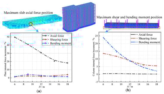 The variation curve of the maximum bending moment, the axial force, and the shear increment of the building slab and column structure with H is drawn in order to explore the relationship between H and the internal force of the building, as shown in Figure 9. It can be seen from Figure 9 that the internal force of the building will increase when the tunnel passes through, compared with cases when there is no tunnel. With the increase in H, the influence of the tunnel on the internal force of the buildings will gradually decrease. The change of axial force is mainly reflected in the plate structure. When H = 6 m, the increase in the axial force between plates reaches 49.7%. The changes of the shear force and the bending moment are mainly reflected in the column structure, and the maximum increases are 13.6% and 23.9%, respectively. In Figure 9, the maximum point of axial force appears at the junction of the foundation slab and the side plate, and the maximum point of shear force and the bending moment appear at the junction of the foundation slab and the column. This shows that the influence of shield tunneling on the foundation of buildings is much higher than the influence of shield tunneling on the superstructure.
