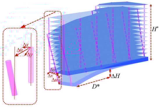 Building inclination is usually divided into two segments: horizontal inclination and vertical inclination, as shown in Figure 10. Horizontal inclination refers to the horizontal displacement components Δx and Δy perpendicular to each other at the top and bottom point of a building, due to deflection. The Pythagorean theorem is used to calculate the total displacement difference Δu in the horizontal direction. The ratio of this displacement difference to the height of the building (Δu/H*) is called the horizontal tilt. The vertical displacement refers to the ratio of the settlement difference caused by the uneven settlement of the building at different points and the distance between two points (∆H/D*).