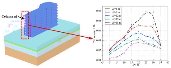 To explore the law of horizontal inclination of buildings, the inclination curve of the corner a1 column of the building is selected, as shown in Figure 11. As can be seen from Figure 11, the horizontal inclination of the building decreases with the increase in H, and the inclination value of column a1 in the beginning increases, and then decreases with the increase in D. The maximum horizontal inclination does not appear directly below the a1 column, and the distance between the position where the maximum inclination appears and the a1 column gradually increases with the increase in H. This information indicates that the inclination of the building is related to the tunnel position and the eccentricity of the building. In combination with the relevant provisions of Code for the measurement of building deformation [33], the horizontal inclination of buildings should not be greater than 0.3%. Therefore, it can be concluded that the influence of the tunnel location on the horizontal inclination of box foundation buildings meets the requirements of the code.