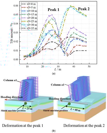 The variation curve of the inclination value of the a1 column with L is shown in Figure 12a in order to explore the relationship between L and the horizontal inclination of the a1 column, when H = 6 m. It can be seen from Figure 12a that with the advance of the shielding tunnel, the inclination value of the a1 column reaches its first peak when L = 20 m to 30 m. At this time, the shield machine is located in the front of the foundation slab of the building, and the deformation is mainly caused by the loss of soil. The second peak value is reached when driving to the range of L = 35 m to 45 m, which is mainly due to the incline of the building to the side and rear caused by the shield machine driving to the rear of the building foundation slab. Figure 12b shows the tilt direction of the building at the two peaks of the tilt change curve by enlarging the building deformation effect diagram 400 times. It can be concluded that the horizontal inclination direction of the building points to the face of the shield construction during the construction of the underpass shield tunnel.