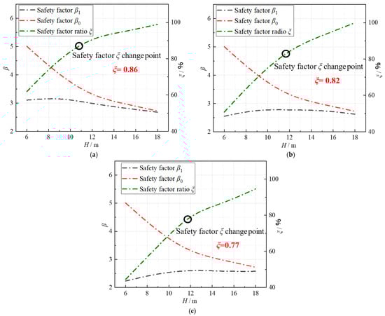 Variation curve of safety factor and its relative ratio with H. (a) Building load = 0.27 MPa. (b) Building load = 0.38 MPa. (c) Building load = 0.5 MPa.