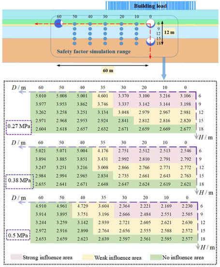 The zoning of the disturbances caused by shield construction is one of the best ways to conduct construction safety. It represents the division of space in accordance with specific criteria that reflects the impact of the tunnel construction on adjacent projects. The zones are usually divided into strong impact areas, weak impact areas, and no impact areas [34]. In this paper, the strength reduction method is used to obtain the safety factor under the action of the building load. The influence degree of the building load on the tunnel excavation construction is determined according to the ratio of the safety factor, and the influence area is further divided according to the criterion of the compound. The strength reduction is concerned only with the tunnel lining and the surrounding clay. In order to simplify the model and reduce the calculation time, the building is constructed as a vertically downward uniform load to simulate the dead weight and the live load of the building. The technical code for tall building raft foundations and box foundations of China [35] states that the burial depth of rafts and box foundations on natural foundations should not be less than 1/15 of the building height. In this model, the buried depth of the box foundation is 3 m, and usually the floors of residential buildings are not less than 6 floors. Therefore, three building heights of 7 floors, 10 floors, and 13 floors are considered in the model. According to the normal level of building load and base pressure, the building load was simplified to a uniformly distributed load of 0.27 MPa, 0.38 Mpa, and 0.5 Mpa, respectively. In order to better describe the impact that spatial location has on tunnel construction of adjacent buildings, the simulation range of D is increased to 0 m ≤ D ≤ 60 m.