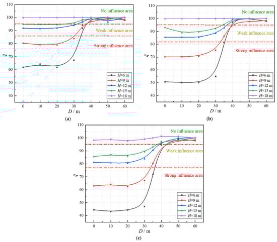 Variation curve of ξ with D under different H. (a) Building load = 0.27 MPa. (b) Building load = 0.38 MPa. (c) Building load = 0.5 MPa.