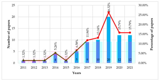 - Reporting and dissemination: An analysis was carried out on start-up accelerators. According to the guidelines, 81 publications dating back to 2011 to 2021 were obtained. Based on the manual verification of publications (reading whole papers), 76 articles focusing on start-up accelerators and their impacts on the sustainable economy were obtained for further analysis.