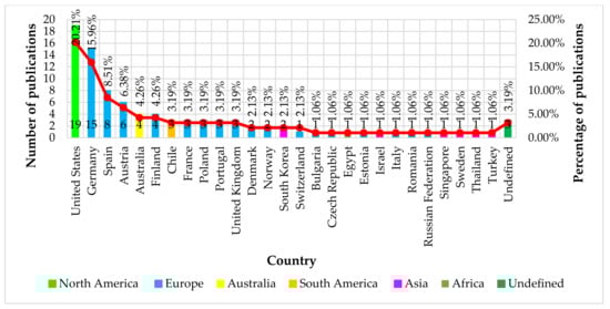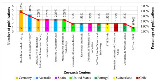 The consecutive figure (Figure 2) shows the geographical breakdown of start-up accelerator research. The highest number of scientific publications on this topic was recorded in the United States (19 publications accounting for 20.21%). However, the majority of publications was written in Europe (58 publications accounting for 61.70%). Research was carried out in 131 international R&D centres. Figure 3 shows the R&D centres that are quoted most frequently in the papers under study. The distribution among numerous continents, countries, and institutions shows that the topic discussed is of global significance and relevance. Additionally, the accelerator programs supporting the development of start-ups implemented by many governmental institutions and accelerators established at universities are factors that underline the significance of this research.