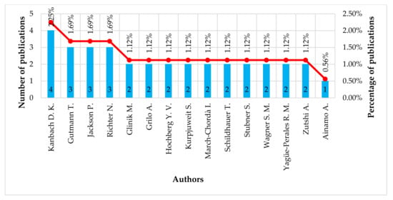 A total of 159 authors wrote papers on start-up accelerators according to the Scopus database (Figure 4). The author who has written the highest number publications on start-up accelerators to date is Dominik K. Kanbach [26,27,28,29]. The runner-up group of authors (Gutmann T., Jackson P., and Richter N.) are authors who have contributed to three publications. Another group consists of twelve authors. Each is involved in two publications. The last group consists of 144 authors. Each has contributed to one publication.