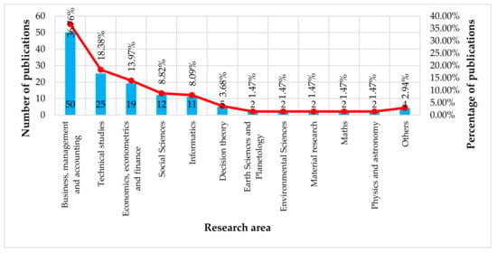 The thematic areas of the publications under study are presented in Figure 5. The publications covered by the study are categorized in 12 research areas. The studied literature is dominated by business, management, and accounting focuses (50 publications). This shows that authors have focused on issues related to the acceleration of start-ups, and start-ups and corporation’s business liaison management via accelerators and the results obtained by doing so play pivotal roles. Consecutive thematic areas include technical studies (25 publications). This may indicate that these papers focused on accelerator programs for technical solutions. This is followed by a series of papers on economics, econometrics, and finance, which highlight the economic efficiency of solutions developed by accelerators. This is followed by social sciences (12 publications), focusing on issues of start-up and accelerator management. The last large set of publications (11 publications) falls into the area of computer science. They focus on the acceleration of new IT start-up solutions.