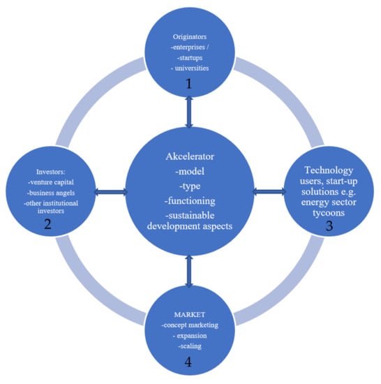 Sustainable development has become a major priority for the modern economy, so decision makers are taking steps to improve its operation in connection with the growing demand for greater diversity, the need for innovative solutions, and the diversification of energy sources. The fundamental improvement drivers include innovation and entrepreneurship [5]. Start-ups are considered to be the major driving force of change and innovation [6,7]. During the sustainable transformation of industries, start-ups play an essential role; therefore, the transformation cannot be carried out by industry tycoons alone. The interaction of these two market players is key for success [5,8,9]. Start-ups are more inclined to test innovative approaches and are characterized by creative thinking [10], speed, flexibility, and risk-taking approaches [11]. The above-mentioned factors are the main reasons that corporations establish business relationships with innovative start-ups, as it enables large companies to obtain access to innovations, new technologies, and the entrepreneurial thinking specific to teams in young companies. The energy sector identified innovation as a key driver of survival in the rapidly changing market environment caused, for instance, by the war between Russia and Ukraine or by ongoing climate change. However, in order to establish such business relationships, both energy companies and start-ups need to plan carefully and manage the change process. In order to ensure the desirable effect of such cooperation, both sides have increasingly noted the need to cooperate with start-up accelerators.