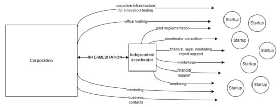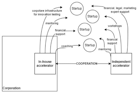 - Kohler, T. Corporate Accelerators: Building Bridges between Corporations and Startups. Bus. Horiz. 2016, 59, 347–357. [Google Scholar] [CrossRef]