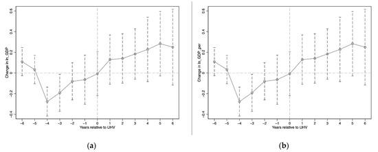 The impact of UHV connection on GDP and GDP per capita. Notes: (a,b) represent the impact of UHV connection on GDP and GDP per capita respectively.