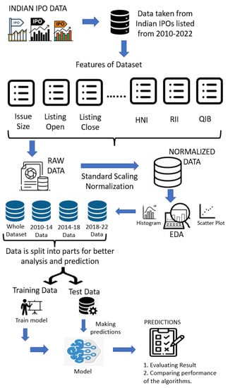 Figure 1 shows a pictorial representation of the system model, indicating the step-by-step process of IPO data analysis and IPO performance prediction. First, we collected Indian IPO data for 2010–2022 from different Internet sources, which included companies’ official blogs, competitive data science websites, and research articles. The dataset had essential IPO features, such as issue size, qualified institutional buyers (QIBs), high-net-worth individuals (HNIs), retail individual investors (RIIs), listing open, and listing close. First, preprocessing steps were utilized to normalize the dataset by using the Z-score normalization technique. This method deducts the mean from the data value and scales each data value to the unit variance. The normalized value for a specific feature value is calculated in the following way [11].