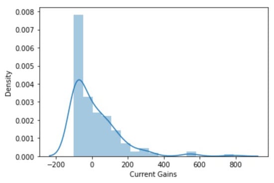 This subsection presents the plots obtained from the data analysis. It includes a density plot of the current gains, a scatter plot showing a comparison of IPO subscriptions of different types of investors, and a correlation map of important features in the given dataset. Figure 2 shows the density plot of the current gain feature of the dataset. The current gain density plot aids us in getting an overview of the relative imbalance in the dataset with regard to the target variable of current gains. From the analysis of our plot, we inferred that a higher proportion of IPO listings had negative gains, i.e., losses, than those with profits that reaped benefits for their investors. This plot behaves as a skewed Gaussian plot. It is clear from the graph that a higher number of IPO listings had incurred losses as compared to those that gave profits. This shows that investing in IPOs has been a risky trend in recent years. On the other hand, careful analysis and study of a company along with market sentiments could help one in investing wisely. This greatly improves the chances of gaining profits from these early investments. The plot shows that some investors earned massive profit percentages (200 and above).