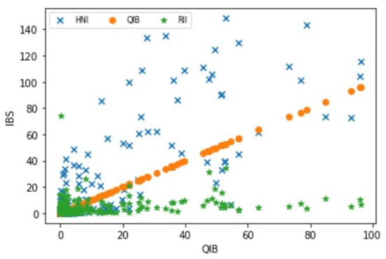 Figure 3 shows a scatter plot of QIB over-subscriptions vs. QIB, HNI, and RII over-subscriptions. The purpose of this plot is to show the correlation between the investing patterns of different levels of investors in the IPO. It depicts how small-scale investors are affected by the investing trends of large-scale investors. The QIB, RII, and HNI counts greater than 150 were considered outliers and were removed from the analysis to get more insights from the result. A significant trend inferred from the graph is that the HNIs largely tended to over-subscribe in comparison with the QIBs. The RII count was observed to lie below 20.