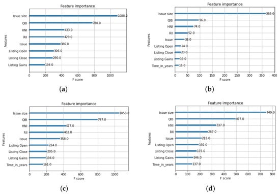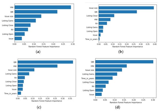 Figure 5d and Figure 6d display the feature importance plots for the IPO data of the 2018–2022 period. The COVID-19 pandemic impacted the financial market for around half of this period. The feature importance of RIIs in the RF algorithm was observed to decrease significantly due to the pandemic’s impact on small-scale retail investors’ investing patterns. Moreover, issue size, QIBs, and HNIs remained important features for both algorithms for this time period.