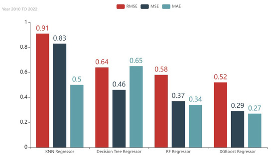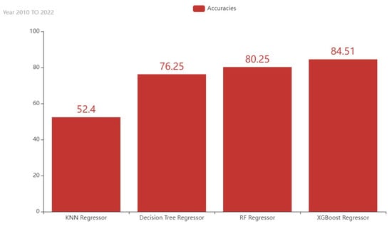 To evaluate the performance of the proposed architecture, we used different evaluation parameters, such as the MAE, MSE, RMSE, and accuracy, to analyze and compare the performance of the models. The MAE is the average of all the absolute errors between the actual values and predictions. Further, the MSE is the average of the squared error; the RMSE is the square root of the MSE and mainly defines the standard deviation of the prediction errors. The accuracy of the model is a measure of how precise the model is at predicting values. We can infer from Table 2 that the XGBoost Regressor had the best MAE, MSE, and RMSE values, i.e., 12%, 2%, and 15%, respectively, for the year of 2010–2014. The accuracy of prediction was also increased by almost 5% by the XGBoost Regressor; hence, it outperformed the other AI models, as shown in Table 3.