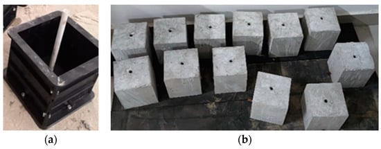 A PVC pipe with an outer diameter of 15 mm and a length of 200 mm was inserted into the bottom center of a standard concrete mold, as shown in Figure 1a. Cement was poured into this mold, then the PVC pipe was pulled out promptly within 6 h after fabrication. Finally, the molds were removed after 24 h and placed in saturated calcium hydroxide solution for 28 d. The details are shown in Figure 1b.