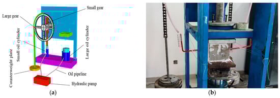 In order to reduce the fluctuation of the continuous pressure load, this test adopted the mechanical loading method using the RRTS-II Rock Rheology and Disturbance Effect Tester [,] as the loading device. When loading, firstly, the hydraulic oil was delivered into the small cylinder and then the big cylinder through the hydraulic pump, then the piston rod in the big cylinder contacted the concrete and provided the compressive stress, and finally the small cylinder maintained the pressure in the big cylinder through the pipeline, thus constituting a pressure stabilization system, as shown in Figure 2. Loading was done using gears and hydraulic secondary expansion, with an expansion ratio of up to 60–100 times or so (the expansion ratio of this test device is 72); the expansion ratio K can be expressed as follows: