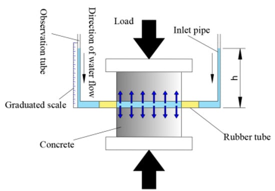 The concrete water absorption system is based on the principle of the linker. Two rubber tubes (13 mm outer diameter) are glued to the two ends of the concrete central aperture, and the joints are filled with glass glue (left for 24 h) to ensure the sealing of the water absorption system. After 10 min of applying load to the concrete in order to reach a predetermined value, two L-shaped (6 mm inner diameter) glass tubes were inserted into the rubber tubes. Then, water was injected from the inlet pipe, and after 24 h of water absorption, the blower was used to dry naturally for 24 h. After 24 h of the water absorption process, the concrete surface showed obvious water stains, and the initial water absorption rate of concrete was approximated after 24 h and 48 h of air drying time, respectively. Therefore, it is considered that the concrete reached the natural drying state after 24 h of air drying