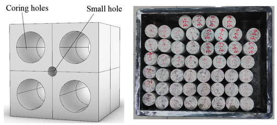 As shown in Figure 3 and Figure 4, Figure. 3 shows the concrete undergoing the process of coupled action of continuous loading and wet-dry cycles. Figure 4 shows the location of each concrete specimen coring (Φ50 mm × 100 mm), and the overall coring.