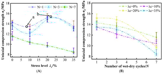 - For the same number of wet–dry cycles, there are two thresholds for the effect of stress level on the uniaxial compressive strength of concrete a and b. The uniaxial compressive strength of concrete decreases with increasing the stress level in the interval from 0% to a. The stress level increases with increasing the load. In the interval from a to b, the concrete uniaxial compressive strength increases with the increase in load. In the interval b to 35%, the concrete uniaxial compressive strength again decreases with the increasing stress level. Meanwhile, the length of the interval from a to b decreases until it becomes zero, as the number of wet–dry cycles increases.