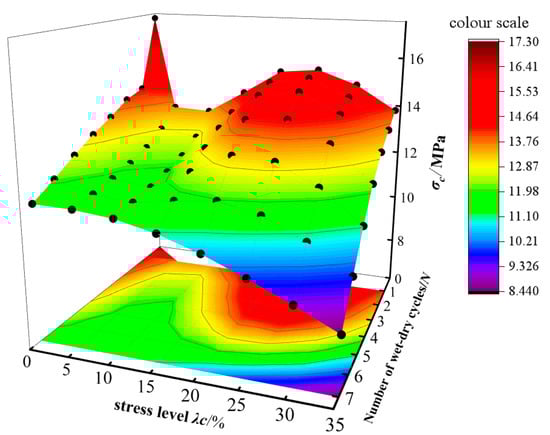 To analyze the variation of the uniaxial compressive strength of concrete under the action of different coupling conditions we used non-linear surface fitting of the uniaxial compressive strength of concrete, with the stress level and number of wet–dry cycles as independent variables in the software origin. After several fitting comparisons, the uniaxial compressive strength RationalTaylor nonlinear surface regression model was obtained, as shown in Equation (3).