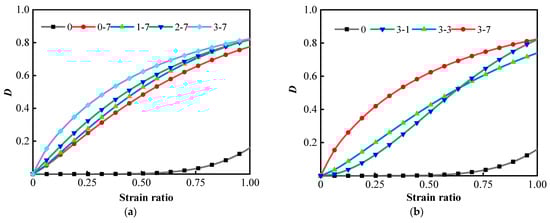 As shown in Figure 7a, the growth rate of the concrete damage variable D at the initial stage was proportional to the stress level, until the strain was less than the peak strain. For both, after the strain ratio was greater than 0.75, the damage variable D tended to level off. The degree of deterioration of concrete deepened with the increase in the stress level of the load applied after the action of multiple wet–dry cyclic processes.