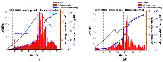 The stress–strain curves reflect the macroscopic damage evolution of concrete. In addition, the study of the accompanying AE test parameters further analyzed the detailed information of the concrete specimens at different stages from a microscopic point of view. Concrete in the uniaxial compression process went through the compression dense stage, elastic stage, plastic stage, and post-peak stage. The corresponding acoustic emission detection went through three periods of calm, rising, and fluctuating phases, as shown in Figure 8a. The three periods of acoustic emission of concrete without the action of coupling conditions could correspond well to the four stages of the uniaxial compression process. According to the literature [], it is known that the “cracking stress” of concrete is around 3 MPa. The corresponding stress level is between 10% and 20%. To visually compare the degree of deterioration effect of different coupling conditions on concrete, the stresses, AE energy release rates, and cumulative AE energy versus time for concrete under the action of coupled conditions with different stress levels experiencing seven wet–dry cycles, and stress levels of 35% experiencing different numbers of wet–dry cycles, are given, respectively.