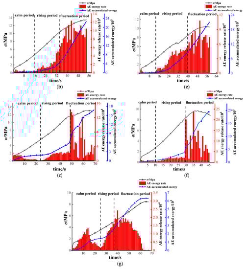 Concrete AE energy release rate, AE cumulative energy and stress versus time, including (a) λc = 0% N = 0, (b) λc = 35% N = 1, (c) λc = 35% N = 3, (d) λc = 0% N = 7, (e) λc = 10% N = 7, (f) λc = 20% N = 7, and (g) λc = 35% N = 7.