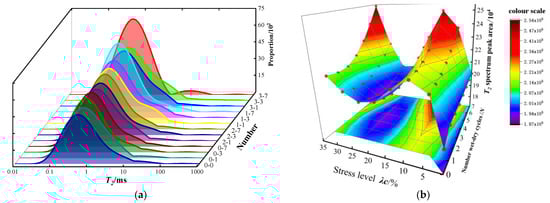 - When the stress level is less than the cracking stress, the T2 peak area of concrete increases with the progression of wet–dry cycles. However, when the stress level is greater than the cracking stress, the T2 peak area decreases and then increases with the progression of the wet–dry cycles.