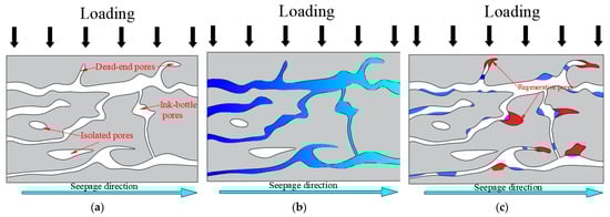After the analysis, the regenerative pore generation inside the concrete is shown in Figure 10. Under the condition of continuous loading, the internal edge pores were subjected to certain stress concentration. At this time and then after the impact of the wet–dry cycles on the edge pores, the strength here was reduced, and then under the action of continuous loading, the fissures were continuously expanded. There was an increase the contact area between the wet–dry cycle and the concrete internal particles. At the same time, the pores in the concrete developed and converge into cracks when the stress level was greater than the “crack initiation stress” stage. However, during the drying process, the water left the concrete in the gas and liquid phase [], and some of the dissolved material was left in the cracks, which led to the phenomenon that the T2 peak area of concrete at this stress level first decreased and then increased.