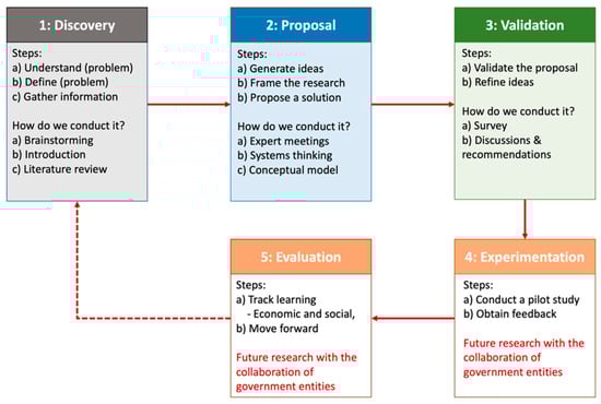 The methodology of this study consists of two main parts: the design thinking approach followed by a survey validation. Design thinking enables us to develop a conceptual model by utilizing the systems thinking process. Figure 1 demonstrates the five stages of design thinking in this study: discovery, proposal, validation, experimentation, and evaluation [14]. According to this roadmap, we first identified the main impediments to Qatar’s economic diversification by brainstorming with a group of field experts and conducting a comprehensive literature review. As a result, we constructed our problem statement based on Qatar’s lack of female entrepreneurship as a catalyzer to economic diversification and thus sustainable development. Then, in the interpretation stage, we focused on recognizing the shortcomings of women’s entrepreneurship and addressing them by developing a conceptual model to empower women’s participation in the economy. This model is developed by performing systems thinking based on the literature review and introduces an integrative and long-term policy framework synchronizing all the stakeholders. Afterward, we validated the proposed policy framework by surveying the validation stage to gather public opinion, including field experts. After the validation, the experimentation stage puts the proposed policy regulations into practice. Last, the evaluation phase assesses the applied policies from various angles, such as financial, legal, and impact analysis. This study sets the last two stages—experimentation and evaluation—as future research because implementing and evaluating policies involve government permissions and long, complex, and detailed procedures. The difficulty here is that policy frameworks have long-term effects on the economy and society.