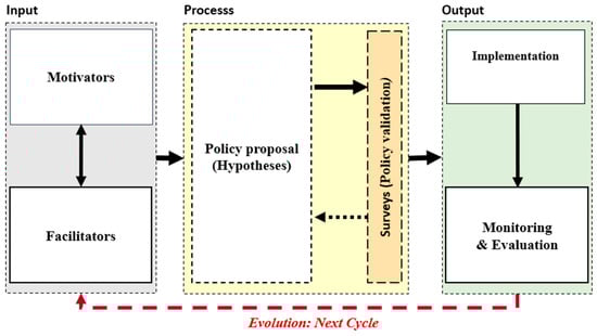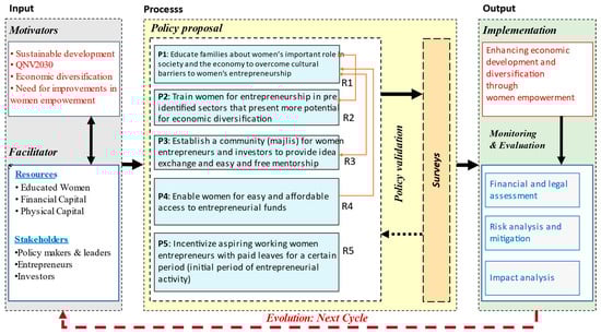 This section proposes an integrative conceptual model for policies enhancing women’s entrepreneurship in Qatar using the systems and design thinking approaches described in the methodology section. The policies act as research hypotheses that are validated by conducting the survey in the next sub-section. The main goal is to improve the economic and social status and participation of highly educated females in Qatar [34]. Figure 3 depicts the proposed framework based on a thorough examination of Qatar’s present motivators and driving factors (i.e., QNV 2030 and the UN’s SDGs), resources, and stakeholders for enhancing women’s entrepreneurship to increase economic diversification away from hydrocarbon. The proposed policies are synchronized to manage their complex relationships seamlessly. The conceptual framework’s input, proposed policy and validation, evaluation, and output components are interrelated in a holistic structure that enables integrated policy formation by coordinating all stakeholders, as seen in Figure 3. In the proposed policy framework, we employed Qatar’s rich resources and human capital, including educated women, and financial and physical capital as a driving force.