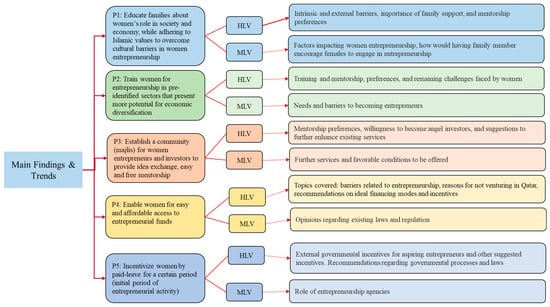 P4—Enable easy and affordable access to entrepreneurial funds for women: accessing funds is entrepreneurs’ most significant barrier. Women entrepreneurs in Qatar face this challenge, as highlighted in the literature review. According to a GEM 2018/2019 report [86], men receive around five times more investment than women. This policy would have to allocate funding mechanisms focusing on the women entrepreneurs, including other women investors.