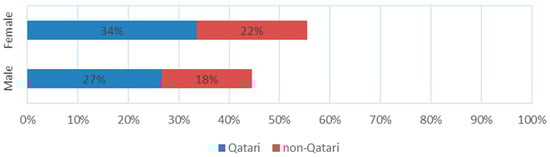 This study concentrates on women’s entrepreneurship to show its potential for increasing economic diversification by incorporating a relatively vital workforce in line with QNV 2030. Economists and researchers from other fields agree that female entrepreneurs are essential for healthy and balanced economic and social development while also stressing the need to tap the potential of this “underutilized” workforce [41,42]. According to various studies, women entrepreneurs are more conscious of the influence of their businesses on the three aspects of sustainability: the environment, community/society, and economics [43,44]. As a result, they support a diverse industry within their communities and establish enterprises maintaining local human and material resources. However, like many other resource-rich states, Qatar provides considerably limited opportunities for women in economic activities. In entrepreneurship and a regular workforce, Qatari women hold only 7% of the legislative, senior official, and management positions, substantially fewer than their male counterparts [45]. In addition, a significant portion of highly educated females, around 64%, who are ready to engage in economic activity, remain housewives [34]. Those women are an “underutilized” force that can contribute to the Qatari economy by diversifying away from hydrocarbon.