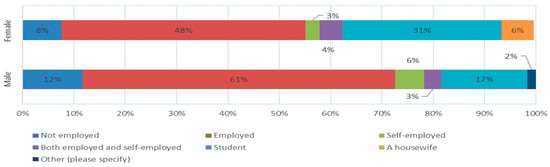 In this survey, the total number of respondents was 402, with 223 females, of whom 14 were housewives. A total of 179 males took part in the survey. There were 242 Qatari respondents, while non-Qatari accounted for 160 participants, as seen in Figure 5. The largest age group is participants aged between 30 and 39, as shown in Figure 6. While a small percentage of the participants are self-employed, the majority are either employed full-time or full-time students, as illustrated in Figure 7. When asked about their experience and/or intentions of being/becoming an entrepreneur, 25% of participants stated they were either actual or aspiring entrepreneurs, while the majority were not, as seen in Figure 8. The subsequent paragraphs offer further elaboration on the above Figure 4 and Table 3 and provide additional statistical insights and results from the survey.