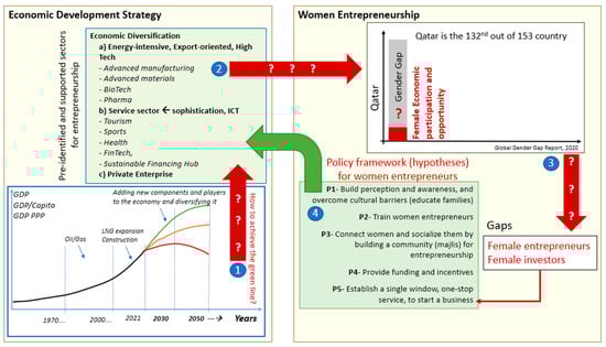 This study proposes an intra- and interlinked policy framework to increase economic diversity and achieve sustainable development by facilitating women’s entrepreneurship and integrating them into the economy. To this end, the rest of the paper is structured as follows: In Section 2, we provide an account of the themes of economic diversification and female entrepreneurship, focusing on Qatar as a case study. The literature also postulates policies to be embedded within the conceptualized policy framework. In Section 3, we developed a holistic conceptual model as an input-process-output policy framework identifying relations within policies by employing a design and system thinking methodology. Then, in Section 4, we validated the proposed model by surveying existing and aspiring entrepreneurs in Qatar, where we also attempted to explore their investment intentions in this sector. We concluded Section 4 with a discussion of the results and provided the conclusion in Section 5.