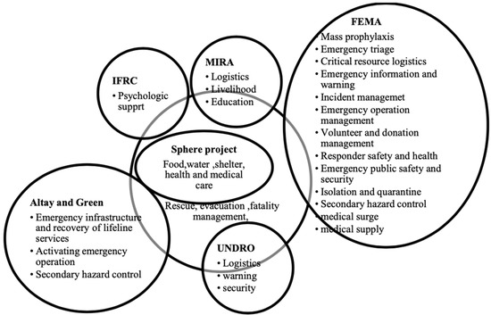 Figure 2 shows where these requirements overlap. The majority of the organisations emphasise on the importance of the key life-saving activities including food security and nutrition, shelter and settlement (including non-food items), water and sanitation and health actions. Additionally, except for one organisation [76] which focuses solely on saving the lives of the survivors, the rest of the sources agree that rescue, evacuation and fatality management, education and logistics are also important. Some criteria emphasise on the importance of secondary hazard control [20,79] whilst some criteria are only mentioned by one source only such as psychological support [78,80], warning and security [2], livelihood [81], emergency infrastructure and recovery of lifeline services and activating emergency operation [20], mass prophylaxis, emergency triage, critical resource logistics, emergency information and warning, incident management, emergency operation management, volunteer and donation management, responder safety and health, emergency public safety and security, isolation and quarantine, secondary hazard control, medical surge and medical supply [79]. To summarise, the key life-saving activities or mass care activities are shared by all above organisations and therefore are the focus of this study.