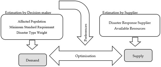 This research addresses two questions: First to what extent is possible to estimate the resources required for humanitarian response operation in the absence of MIRA report within the first three days. Second to what extent is possible to optimise the resource allocation decisions within humanitarian response operation considering the preferences of the decision makers. This question is answered by a scenario-based decision making process to optimise the balance of available resources in possession of suppliers (supply) to the needs of the affected area (demand) as illustrated in Figure 3. The focus on this research are natural onset disasters or disasters with no-notice [22] such as eruption or earthquake.