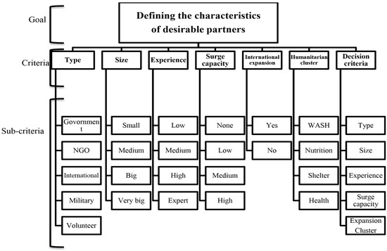 The respondents are asked to identify in respect to each one, the criteria for partner selection which criterion is more important and how much more important on a scale of 1 to 9. This is the basis for questionnaire 1 (decision preference). These criteria include the type of partners (Government, NGO, Military, International organisations such as Red Cross and UN and volunteers), size, experience of the partners, their surge capacity (the ability to rapidly expand beyond normal capacity to meet the increased demand) and their cluster (WASH, nutrition, health, shelter). The first questionnaire is given to both groups of participants in order to identify their preferences. The goal, criteria, and sub-criteria considered in this questionnaire are articulated in Figure 4.