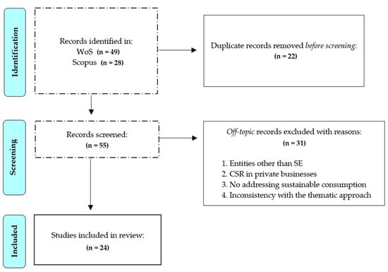 After the identification of duplicates considering the title and/or abstracts, 22 publications were removed (77.2% of those extracted from Scopus), and 55 documents followed into the screening phase in which off-topic documents were removed considering the title and abstracts. The volume of off-topic results was not negligible (n = 31, 56.6% of the total), and the main reasons behind the drop were (1) publications that revolved around entities erroneously referred to as SEs when in fact they were non-governmental organizations (NGOs), nonprofits (NPOs), or simply for-profit businesses practicing cause-related marketing campaigns; (2) publications that addressed (corporative) social responsibility-based policies/measures in private businesses; (3) publications that dealt with SEs but not in relation to sustainable consumption; and (4) publications that included “social enterprises” and/or “sustainability” in the title and/or abstract but that did not directly address these issues in the rest of the work. Once discarding the off-topic results identified, the authors obtained 24 papers for final review.