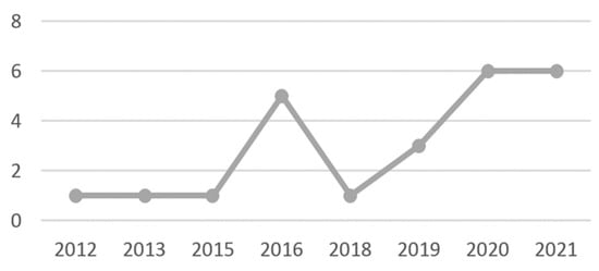 SEs and sustainable consumption are very recently connected topics within a still sparse literature, according to the distribution of publications over time (Figure 3). This being said, it is important to point out a remarkable increase of the scholarly literature (+87.5%) since 2015. Not accidentally, this increase of literature coincided with the adoption of the 2030 Agenda and the corresponding publication of the 17 SDGs, and it amplified the wake of previous literature anticipating the potential of social economy—and SEs in particular—to achieve a more sustainable development [10,11,12,13,14,15,16,18,19].