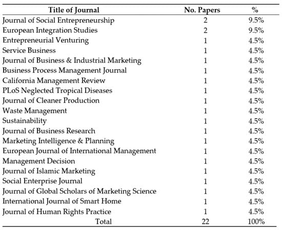 The combination of words and connectors (AND; OR) employed proved to be the most effective within a hitherto unexplored field of study, bringing together, first, the use of wide-ranged but specific terminology related to topics of interest (i.e., social enterprise; sustainable; product; consumption) and, second, the gathering of sufficient publications to conduct a systematic review with assurance of robustness. In the same line, previous theoretical delimitations of main terms were useful to identify similar and/or complementary words and concepts to be finally included in the equation in order to amplify the search boundaries. SEs, for instance, are regularly accepted within the previous literature as “social businesses”, since they develop business activities for a social purpose or mission [8]. Similar is the case of “responsibility” and “ethics” with regard to “sustainability”, as specific studies on sustainable consumption, social responsibility, and (corporative) management regularly approach these terms as related, even interconnected [41,42,43,44,45,46].