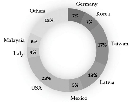 Regarding the geographical distribution, at least eight countries produced 82% of the 73 authors involved in the literature reviewed (Figure 5). Three geographical poles could be distinguished: Asian affiliation represented 30% of the total, followed by American affiliation, with 28% of the documents (with the USA leading by a wide margin), and authors belonging to European institutions, with 24% of the results.