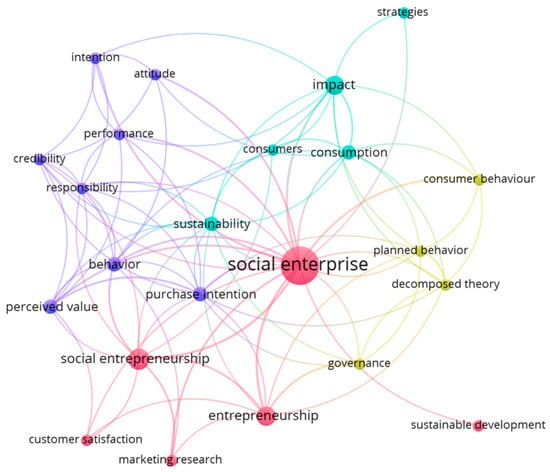 As expected, the most used keyword is “social enterprise”, a field of study on which this literature review is focused (red node). From this central keyword, numerous categories of analysis are born, which advance the subsequent study of the main themes (social entrepreneurship, sustainability, and behavior, among others). Keyword co-occurrence analysis identifies four clusters in which keywords associate. In each cluster, there are one or more items related to behavior and sustainability (i.e., sustainable development, purchase behavior, sustainability), so that the main themes can be visualized, which will be analyzed in detail in the following section.