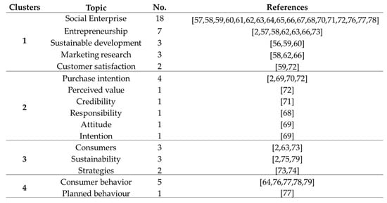The authors found that 21% of the papers selected in this bibliometric analysis belong to the second thematic cluster [68,69,70,71,72]. The most important topic studied in this cluster was purchase intentions, contained in 4 of the 24 selected papers. Some authors focus their studies on the social mission with which an SE may be born, because it can affect the competitiveness of the enterprise and consumer behavior. The second of the topics highlights the importance of perceived value as a key factor in determining consumer behavior in SEs. These consumers especially appreciate the social value of their products, but also consider their utilitarian and emotional value. Credibility and responsibility are other topics identified. These studies analyze whether SEs have greater credibility than traditional enterprises or whether the image of corporate social responsibility (CSR) and credibility of both the SE and the social entrepreneur can be a determinant of consumer behavior. Additionally, consumers’ intention to purchase social products is related to attitudes.